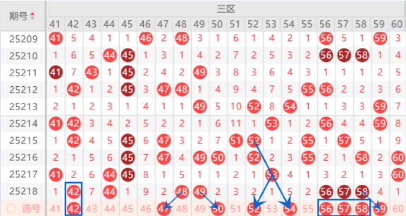 该区间的42号数字我们注意出重号的情况。上期开出了48 49号数字,本期不看好出重号,所以本期我们要注意出分边的情况,所以本期的47 50号数字我们要注意出一个号码的情况。本期的52号数字我们注意出一个号码的情况,本期的52号数字和42号数字的走势有点类似,可以关注一下。本期的54号数字是属于空五对称,是有机会出号的,我们可以关注一下。上期开出了56 57 58号数字,本期我们注意出一个重号的情况,其中的56 58号数字可以重点关注一下。