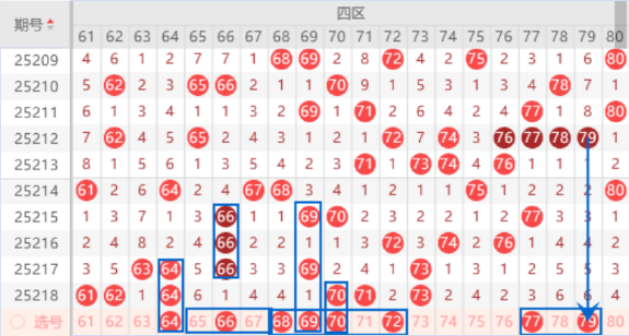 该区间的64号数字我们注意一下走三重的情况。本期的65 66 67号数字是属于重号66号数字边号回补号码,本期防守出一个号码的情况,其中的66号数字就可以重点关注一下。本期的69号数字是属于空一对称号码,出号机会是有的,本期可以防守一下68 69号数字同出的情况。上期开出了70 71 73号数字,本期我们注意一下出一个重号的情况,其中的70 71号数字可以重点关注一下。本期的78 79号数字我们注意出一个号码的情况,其中的79号数字可以重点关注一下。