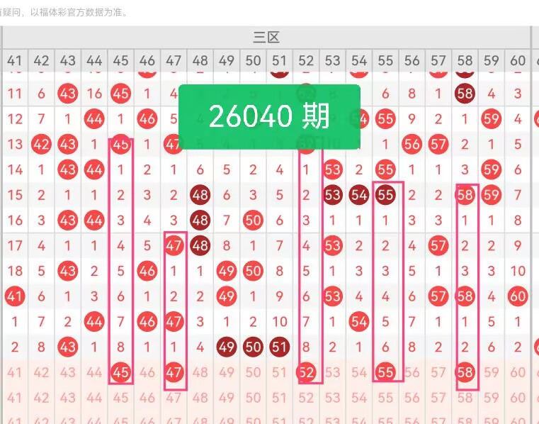 上期第三区间开奖4个号码,本期可能会增加开出。三区承上启下,是号码衔接的关键区域,45、47为奇数小号,52为偶数中号,55、58为奇数与偶数搭配,兼顾奇偶与大小比例,号码分布松散有序,贴合区间轮动规律,既能衔接前区,又能呼应后区,提升整体组合的平衡性。