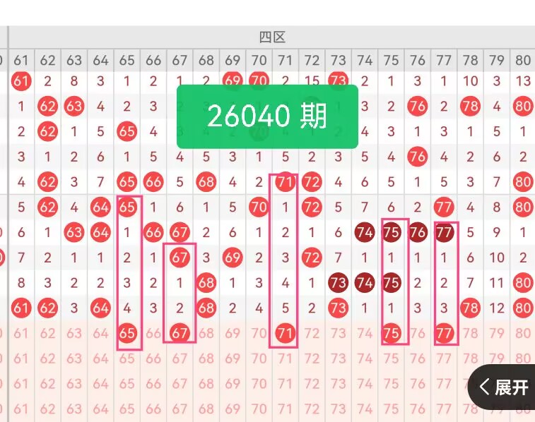 上期第四区间开奖7个号码,本期有望减少开出。四区作为高号区域,本期保持适度活跃,65、67、71、75、77均为奇数高号,间距均匀,分布合理,避免过度集中,适配高区号码平稳开出的节奏,与其他三区形成完整的号码覆盖,整体组合协调统一。