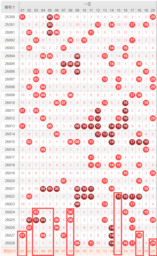 一区:最近一区10期出号情况为:2 3 8 8 3 4 8 4 5 6,总出号情况为51个,平均出号5.1个,本期一区号码推荐出号为:01 03 04 05 08 15 18 20。重点关注:01 04 05 08 15 18。