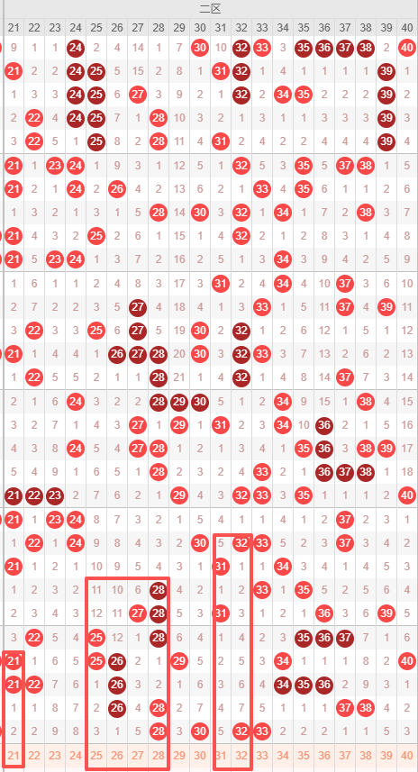 二区:最近二区10期出号情况为:4 6 3 3 5 6 6 6 4 4,总出号情况为47个,平均出号4.7个,本期二区号码推荐:21 25 26 27 28 31 32。重点关注:21 26 28 32。