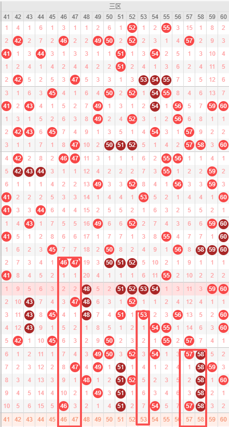 三区:最近三区10期出号情况为:7 4 7 4 5 6 5 5 3 5,总出号情况为53个,平均出号5.3个,本期三区号码走势推荐:46 47 53 57 58,重点关注:46 47 53 57 58。