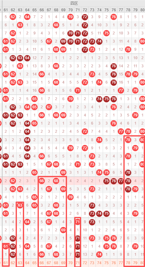 四区:最近四区10期出号情况为:7 7 2 5 7 4 1 5 8 5,总出号情况为51个,平均出号5.1个,本期四区号码推荐:61 63 66 67 68 69 717 8 79 80,重点关注:63 67 68 69 80。