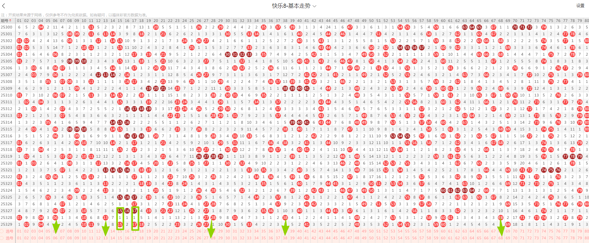 从这张走势图可以看到我画标出来了遗漏示意号码,开出了隔期(遗漏一期的)2个号码(绿色方块标示的),数量与上期减少,从近期走势图看隔期码回温态势形成,本期判断热度回温,落号5个号码概率较大(绿色箭头标示的06、13、28、38、68)需要关注,有下号概率;