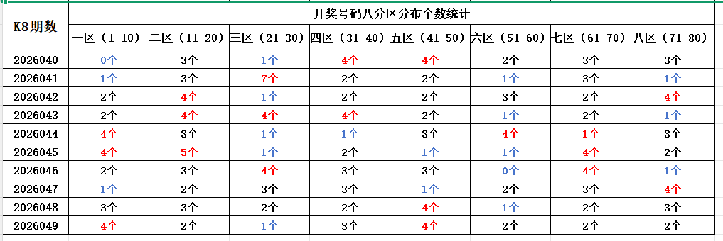 首先看上期回顾,“快乐8”第26049期开奖结果:1.6.7.8.11.17.28.35.36.39.41.42.44.48.53.60.61.69.72.75通过分析开奖号码,分享第一个数据分析:统计开奖号码的八分区冷热走势,判断出号规律。以近10期开奖号码的八分区统计数据为例: