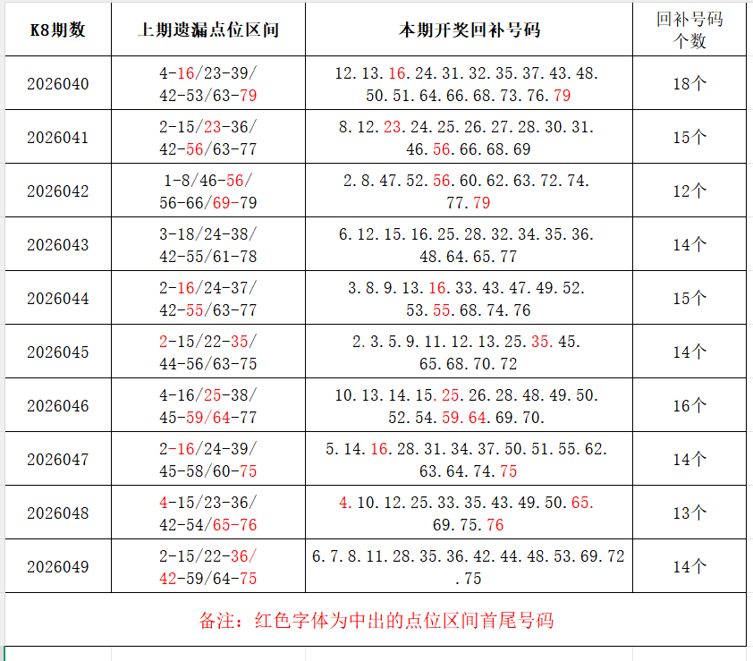 如图,上期的遗漏号码在下期开出10个左右,即为回补号码。定准点位区间首尾号码是关键!以上期2026049期为例,定位4个遗漏区间,围中14码!结合上期开奖号码,以跨度值大于或等于7为依据,本期关注4个遗漏区间:17-28/28-35/53-60/61-69;重点关注遗漏区间:2-16/23-35/40-54/63-76。点位区间号码和大底号码请勿混淆,个人分析,仅供参考。