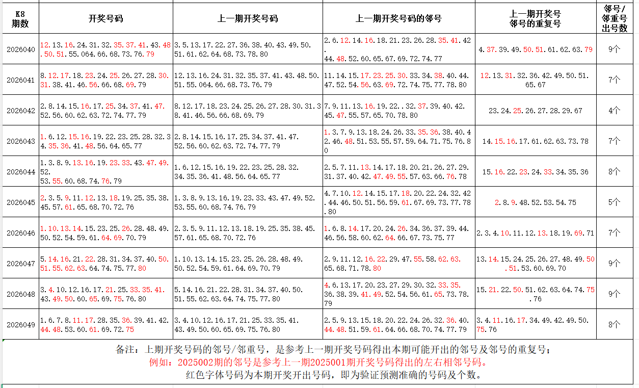 如图,红色字体是上期邻号、邻重号在下期开出,每期开出10个左右。上期邻号开出4个,邻重号开出3个本期参考邻号:2.5.9.10.12.16.18.27.29.34.37.38.45.47.49.52.54.62.68.70.71.73.74.76;邻重号:6.7.8.35.36.40.41.42.43.60.61;个人分析,仅供参考。