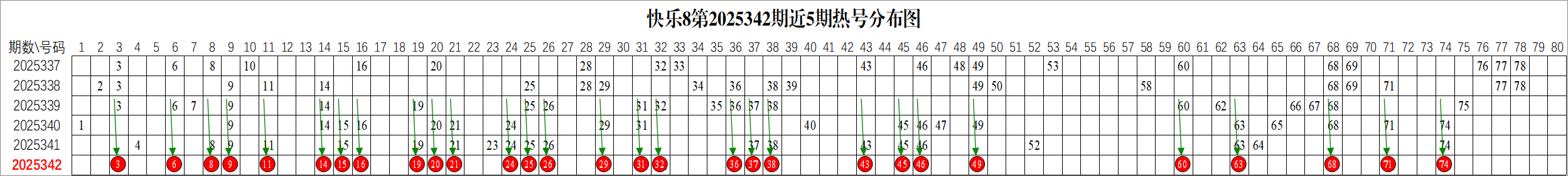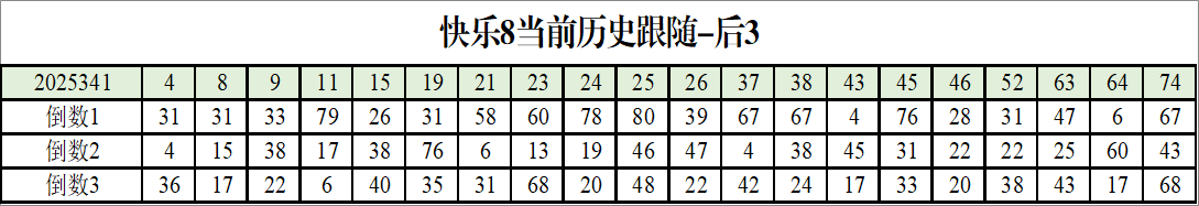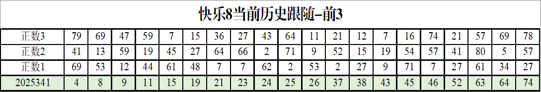 我感觉选热的同时,还要注意防冷条件开出,可以直接选取每个号码跟随出次前三的号码,也可以考虑把出次最后的三个数字加进去,不过这样可能号码太多,可以尝试。图上也能看出单独号码跟随的情况,我就不一一统计每个号码的出次了,我这里考虑提高概率,取每个号码历史跟随的前三号码和后三号码,根据2025341期的号码,我关注正数3和倒数3的号码号码为: