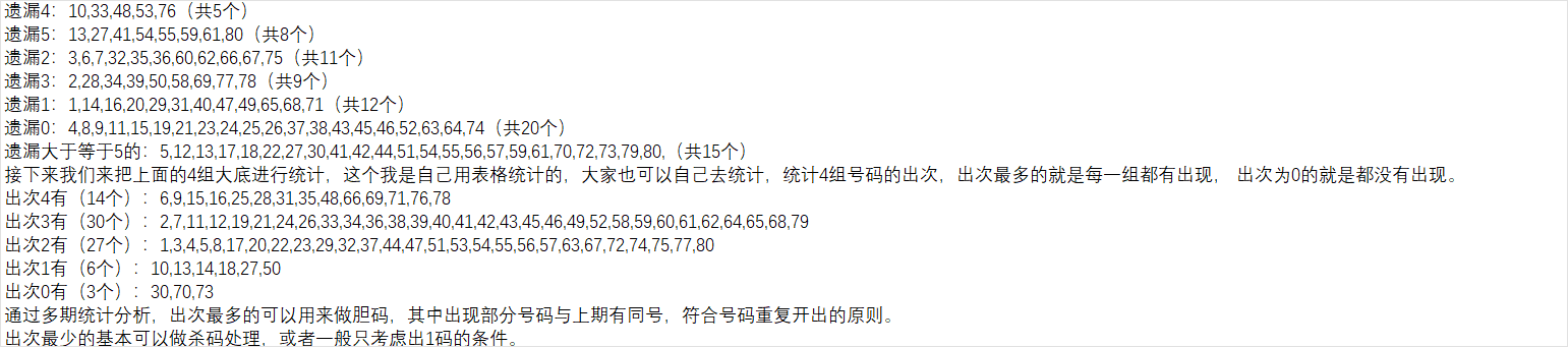 我的基本思路是通过号码尾数情况,取出6尾相关的号码作为第一组大底,然后统计号码跟随的情况分析出第二组大底,通过短期遗漏分析形成第三组大底,再按照对数补数分析统计出第四组大底(根据情况可能实时增加其他大底 ),最后把这些大底进行统计,重点关注出次最多的号码,搭配出次少的号码,灵活组号,形成本期精选胆码。