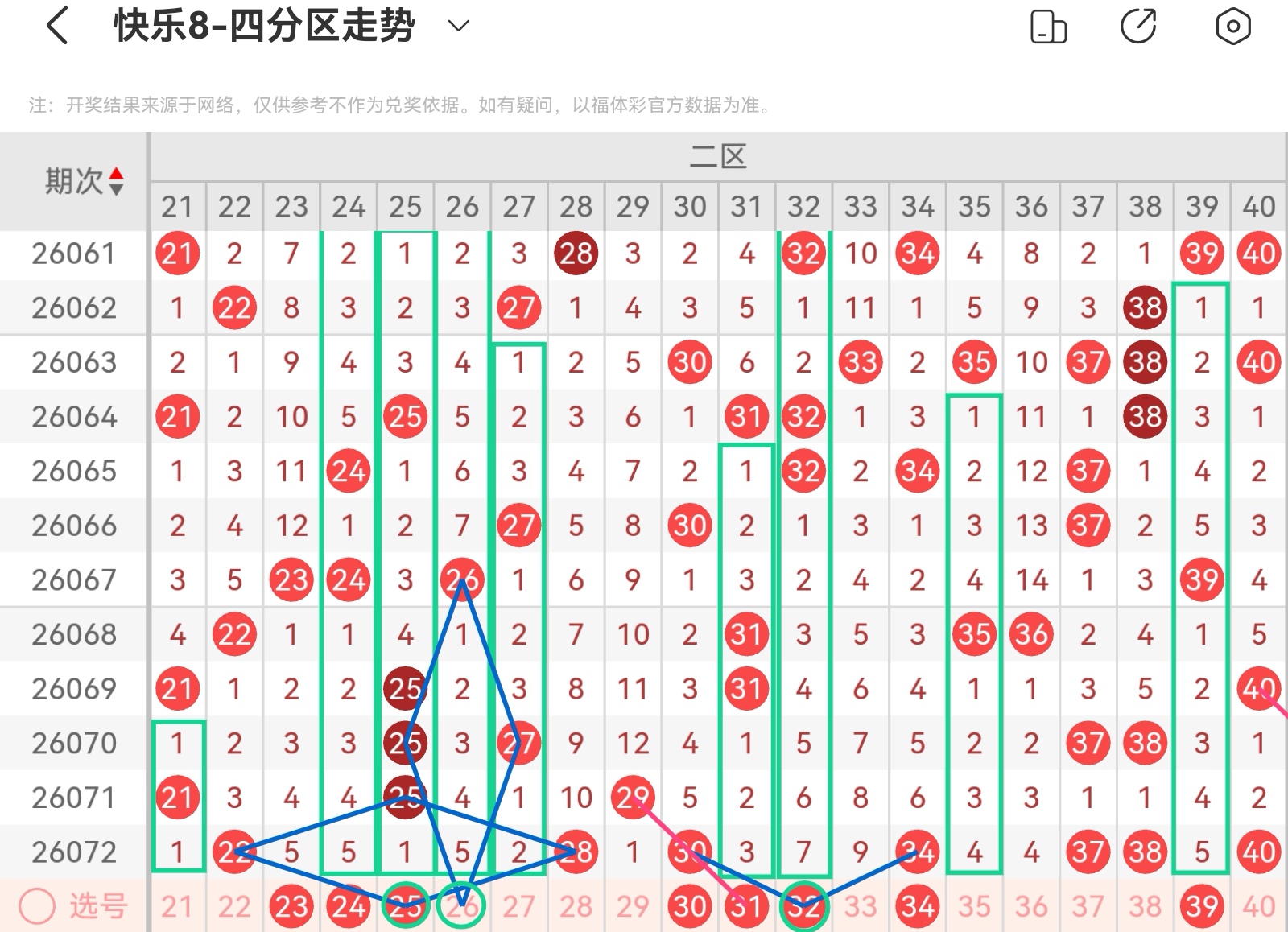 上期开出码,区间平稳,本区防3-5码开出。上期重号开出本期重号防一码开出,注意30.34开出重码的可能大遗漏号32.33上期形态走势开六码,本区形态走势有:21.24.25.26.27.31.32.35.391-3码, 重点关注24515走势,31的隔期空三走势,39的隔期空五走势以及26175走势,小防27332走势以及32727走势上期空位走势开出无,本区空位走势有:空一29.39,空二35.36,空三中心号32,空五中心号25,共六码防上期斜连走势开出,本区斜连走势有三斜连23.27.31.40,共四码防本区注意重号、连码以及空位号码,隔期号码回补开出。