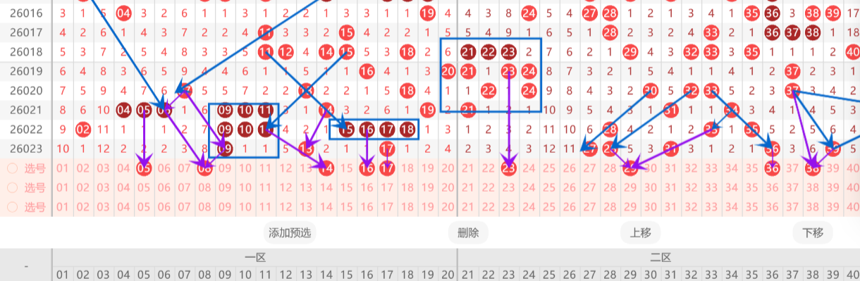 第二:判断第一区间热度会有所上升,注意一些奇数偶数搭配的联动号码,需关注斜连形态的号码。
