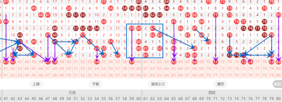 上一期第三区间开出:42/45/50/55/57这五个号码,那么本期对于区间我们如何进行号码的选择呢?选择号码的重点方向在哪里?我有以下几点判断。