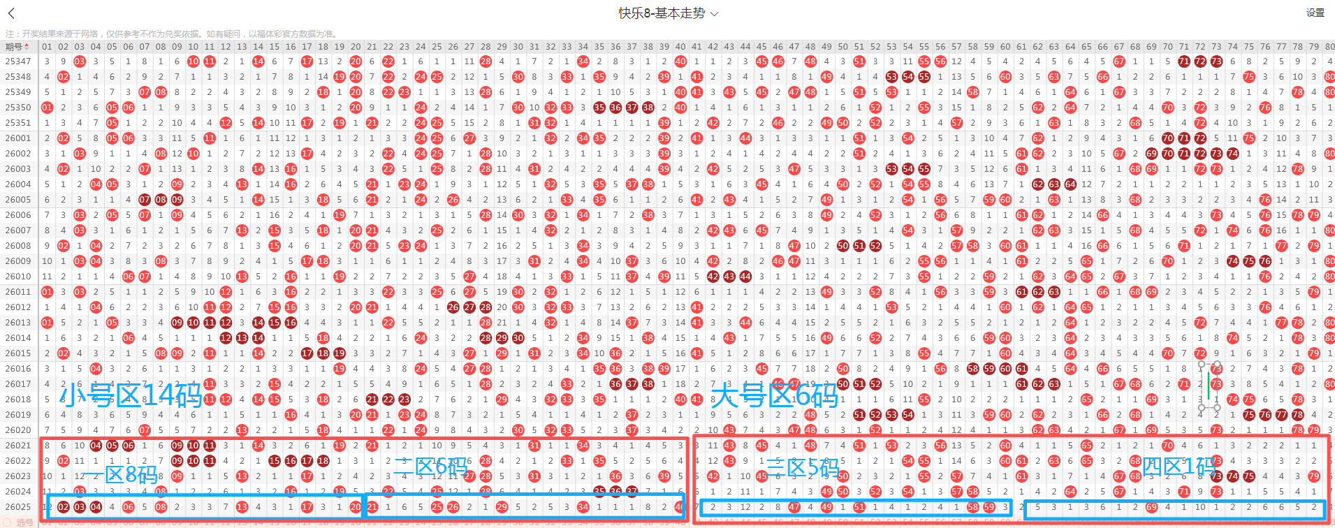 上图是快乐八2026025期区间走势图,从图中看到小号区(1-40)开出14个出奖号码,从开出数量上看与上期开出数量增加,热度上升温,从小号区近10期出号情况看,整体小号区前区近期偏温趋势;大号区(41-80)本期开出了6个出奖号码,从开出数量上看与上期开出数量减少,热度降温,从近期出奖号码个数看属于偏温态势,下期快乐八2026026期大号区号码大概率热度回温延续,大小区间主看大区号码热度回温概率较大,大小比具体区间比可参考11:9,防10:10的比例;再从细分区间来判断,按走势图四分区分成四个区间,一区(1-20)开出来的号码有8个;二区(21-40)开出来的号码有6个;三区(41-60)开出来的号码有5个 ;四区(61-80)开出来的号码有1个;数据上看本期出奖号码集中分布在一区。从号码落位区间形态上看,快乐八2026026期主看二、三区热度回暖的态势,落号几率较大,建议密切关注。