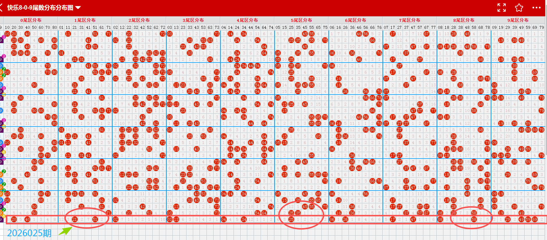 上图是快乐八2026025期的尾码走势图,从图中看0尾到9尾出号个数依次是:0尾号码区开出2个;1尾号码区开出2个;2尾号码区开出1个;3尾号码区开出2个;4尾号码区开出2个;5尾号码区开出1个;6尾号码区开出2个;7尾号码区开出2个;8尾号码区开出2个;9尾号码区开出4个;再看小尾号码(0尾-4尾)区有9码,大尾号码(5尾-9尾)有11码;数据比对统计后可以看到本期9尾出号数量最多,一共开出了4个中奖号码。本期没有出现断区!由走势比对推断2026026期重点需要关注1、5、8尾区号码下号热度回补和落号数量增加的概率较大。