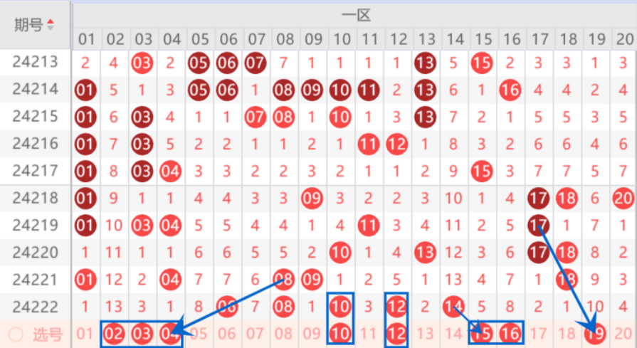 本期的04号数字我们注意一下出号情况,本期是属于4连空一对称号码,也是04 06 08号数字的三斜连号码,出号机会是有的,本期我们要防守一下02 03 04号数字同出的情况。上期开出了06 08 10 12 14号数字,本期我们要注意出重号和出夹号的情况,重号重点关注一下10 12号数字就行了,夹号可以关注一下09 11号数字的出号情况。