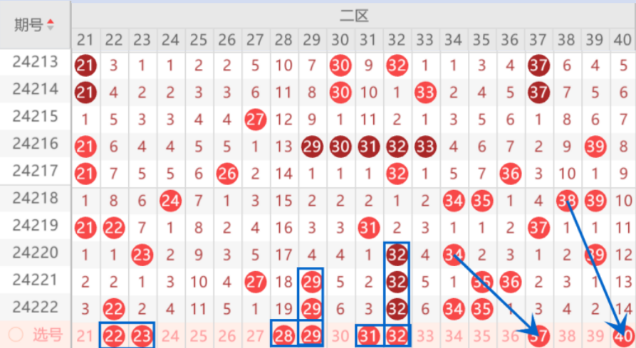 上期开出了22 29号数字,在该区间有两个冷号为25 28号数字,本期我们注意一下出一个号码的情况,其中的28号数字我们可以重点关注一下,上期的28号数字是属于夹号,以前是经常夹出来的,上期没有被夹出来,本期是有可能回补出来,这里注意一下28 29号数字同出的情况。本期的40号数字我们也是要注意出号情况,上期开出了35 46号数字,在该区间有三个冷号,本期也是很容易出一个号码的,其中的44号数字出号机会不是很大,43号数字在没有看到42 49号数字同出之前是不好出号的,所以本期的40号数字我们可以重点关注一下。