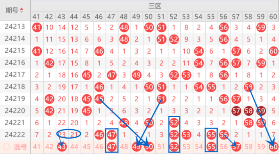 上期开出了46 47号数字,本期我们要在注意一下出一个重号的情况,其中的47号数字出重的机会是比较大的,从尾数上看,刚好和67号数字对应,所以本期的47号数字出号机会很大。上期开出了52 53 55 56号数字的连号,本期我们注意一下出重号的情况,其中的52号数字我们注意出三重的情况,如果本期的52号数字不出,那么大概率是会出55号数字的重号了,我们要注意一下。