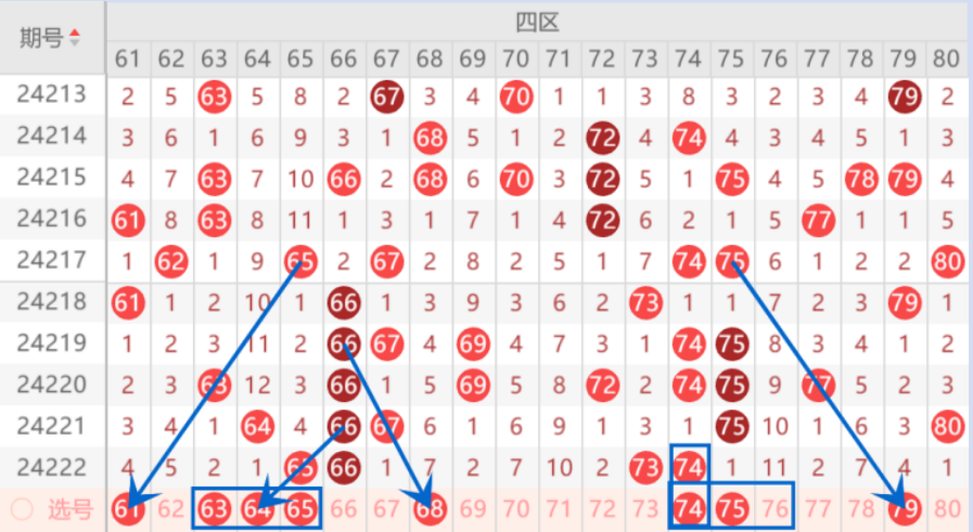 本期的64号数字我们注意一下出号情况,本期的64号数字是属于冷号回补号码,也是三斜连号码,出号机会是有的,这里我们可以防守63 64号数字同出或者64 65号数字同出的情况。本期的75号数字我们注意一下出号情况,上期的74号数字是重号空一对称号码,本期的75号数字也是属于重号空一对称号码,是一样的走势,所以本期的75号数字出号机会也是有的,这里可以防守一下74 75号数字同出的情况。