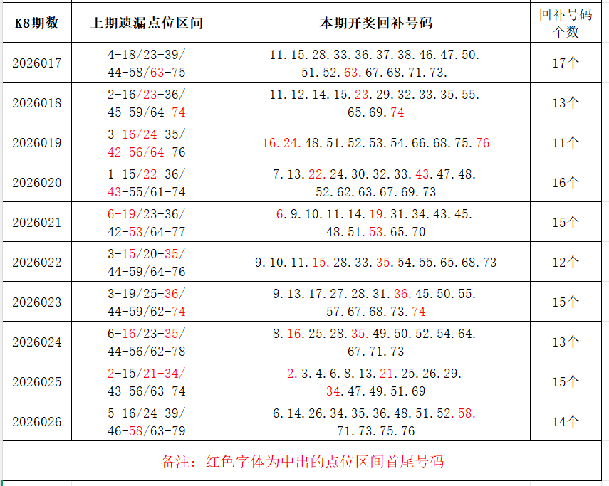 如图,上期的遗漏号码在下期开出10个左右,即为回补号码。定准点位区间首尾号码是关键!以上期2026026期为例,定位4个遗漏区间,围中14码!结合上期开奖号码,以跨度值大于或等于7为依据,本期关注4个遗漏区间:6-14/26-34/36-48/62-71;重点关注遗漏区间:3-15/22-36/43-59/61-74。点位区间号码和大底号码请勿混淆,个人分析,仅供参考。
