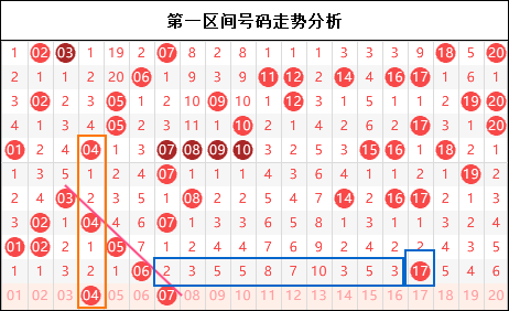 本期开奖号码区间比2:4:7:7,实在是以外的惊喜,一区居然再一次走冷,与二区的衔接断区也没有太大的作为,这就让我们再三四区拿到了不错的结果,至少区间的周期上与我们的思路是一样的。所以这样的机会不多,趁着这一波走势我们一定要好好大干一场,拿下九月的第一个超级大奖。具体思路我们来分解各个区间。
