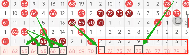 第四区间号码61-80,本区开出四连号,大家注意,这四个号码中一定会有一个号码出现或者前后有一个紧挨着的号码出现。71-80直接断掉,一个号码没有出现,这也意味空间打开,无限想象。但有一个重点大家一定要关注到,四连号目前出现好几期,例如71 72 73 74,68 69 70 71, 64 65 66 67.看出来吗,它在逐步往前移动,这个时候如果你按照常理分析的话,下一期如果有四连号一定会往前,你能看出来,机器一定也会懂得买卖人的心态,这个时候我们是不是打破常规,让他往后看呢。刚好遇上后面空出来,那是不是给够了空间。