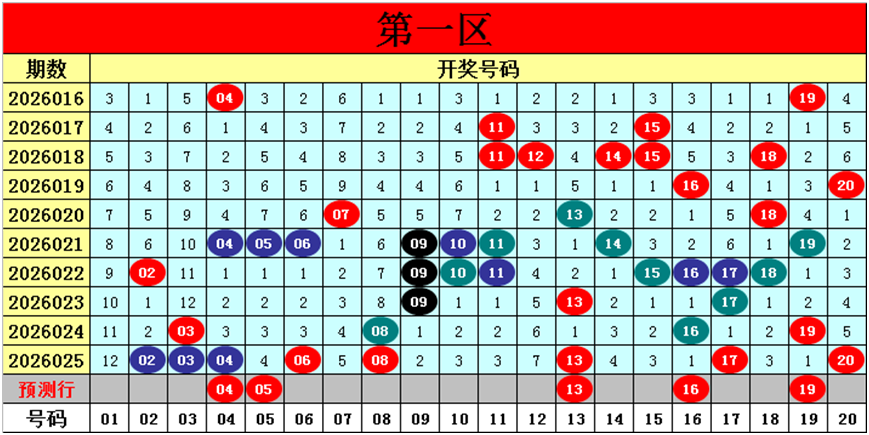 目前第一区包含11个热码:重码8个02、03、04、06、08、13、17、20,邻码3个09、16、19,孤码0个;包含7个温码:邻码4个05、07、14、18,孤码3个10、11、15;包含2个冷码:邻码2个01、12,孤码0个;号码冷温热个数比为2:7:11,重号、邻码、孤码个数比为8:9:3。
