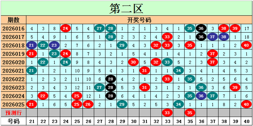 目前第二区包含14个热码:重码6个21、25、26、29、34、40,邻码5个22、27、28、35、39,孤码3个31、36、37;包含5个温码:邻码3个24、30、33,孤码2个23、32;包含1个冷码:邻码0个,孤码1个38;号码冷温热个数比为1:5:14,重号、邻码、孤码个数比为6:8:6。