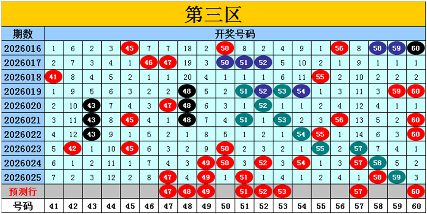 目前第三区包含12个热码:重码5个47、49、51、58、59,邻码3个50、52、57,孤码4个42、45、54、55;包含5个温码:邻码2个48、60,孤码3个43、53、56;包含3个冷码:邻码2个41、46,孤码1个44;号码冷温热个数比为3:5:12,重号、邻码、孤码个数比为5:7:8。