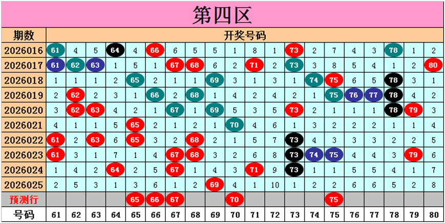 目前第四区包含10个热码:重码1个69,邻码1个68,孤码8个61、64、67、71、73、74、75、79;包含8个温码:邻码1个70,孤码7个62、63、65、66、76、77、78;包含2个冷码:邻码0个,孤码2个72、80;号码冷温热个数比为2:8:10,重号、邻码、孤码个数比为1:2:17。