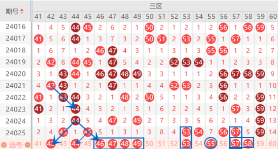 该区间的42号数字是属于V型号码,我们注意一下出号情况。本期的44号数字我们可以防守一下出号情况,33 44也是有机会出号的。本期的我们注意一下46 47 48 49号数字的出号情况,这里应该是会出两个号码的,我们要重点关注一下。上期开出了53 54 56 57 59号数字,那么本期我们就要注意一下出重号的情况了,当然夹号也是要注意的,重号重点关注一下53 57号数字的出号情况,夹号55 58都需要注意一下。