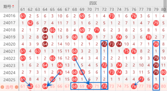 该区间的64号数字我们注意一下出号情况,属于三斜连号码,出号机会还是有的。本期的68号数字我们注意一下出现三重号的情况,本期可以防守一下68 70 72号数字同出的情况,本期的72号数字是属于空二对称号码,本期出号机会还是有的。上期开出了77号数字,本期我们注意一下分边的情况,重点关注一下76号数字的出号情况。本期的78 79 80号数字我们防守一下出一个号码的情况,本期不出那么下期我们就可以在这里定胆码了。