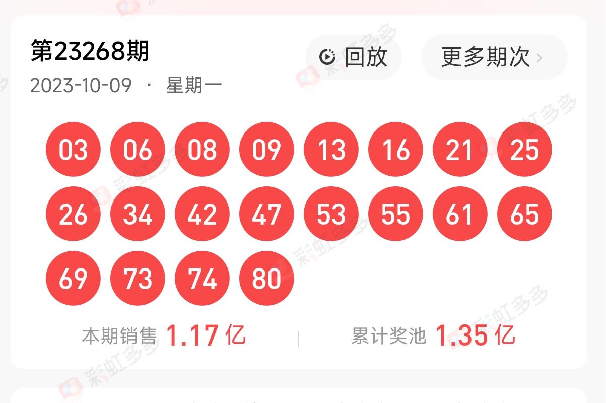 首先回顾上期的开奖号码:03 06 08 09 13 16 21 25 26 34 42 47 53 55 61 65 69 73 74 80