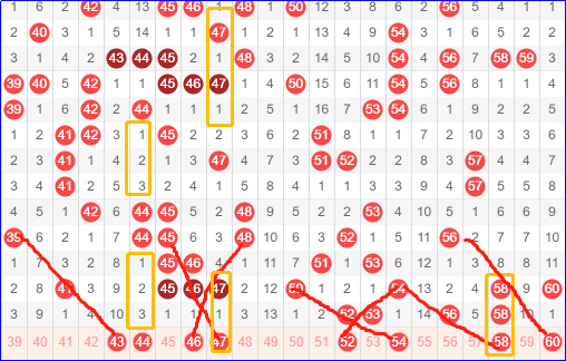 第三区间号码41-60,三区防守以每次开出两个号码而失败告终,虽然四连号没有在这里一期展现,但是咱们防守的号码也是全员皆来报道。随着前半段45-46-47的落幕,新一轮的周期即将开启。我们继续追寻新的痕迹,这一次必抓胆码。