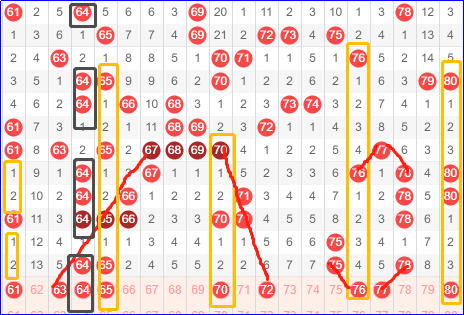 第四区间号码61-80,我承认这一区间我就看好65了,其他真是看不懂,305期这里应该走势回归是正常的事情了。当然,如果今晚一区再爆或者换到二区爆,那就没办法了。但至少这一定会留下一点面子号码的。无疑目前来看最好的走势依然是64-65两个号码。