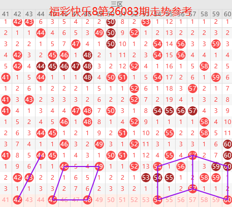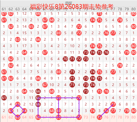 福彩快乐8是从01-80个号码中每期开出20个号码,我们把80个号码分为四个区:一区01-20号,二区21-40号,三区41-60号,四区61-80号