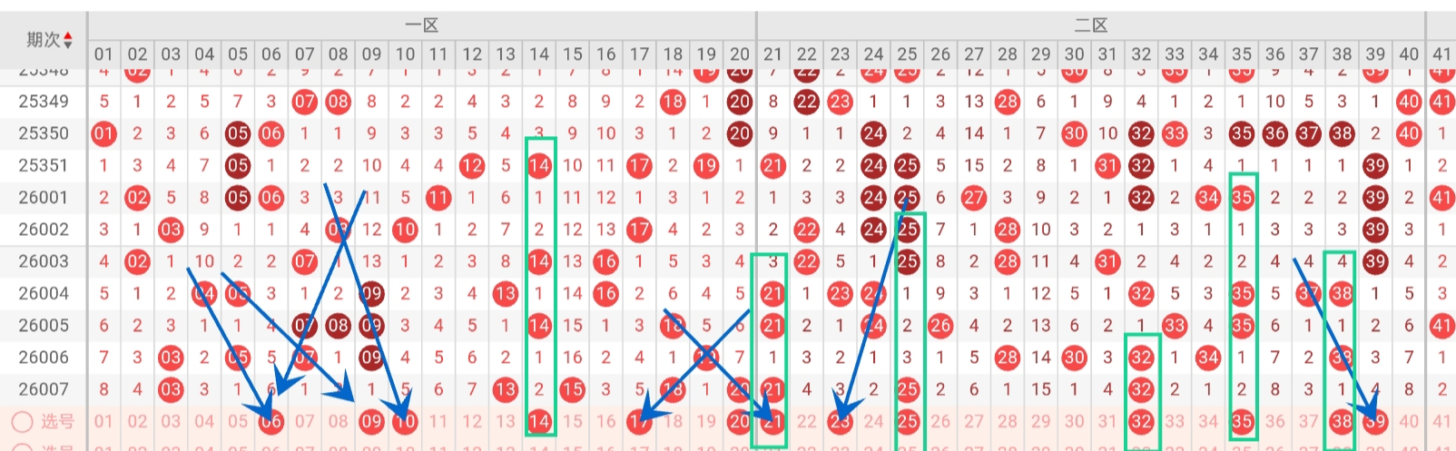 二区上期开出21-25-32,共3个号码,本期大家可以根据尾数、隔期码、以及边码走势情况,本期首先需看20相邻码、22会再出现;上期21-32区间开出稀疏号,本期22出号机会比较大,本期二区有连续号22-23预测会出,上期龙头21,凤尾32,本期预测龙头21、凤尾38,本二区间建议大家关注号码22会出,再根据号码走势预防连续号22-23预测会出。综合分析筛选,本期二区推荐:21-23-25-32-35-38