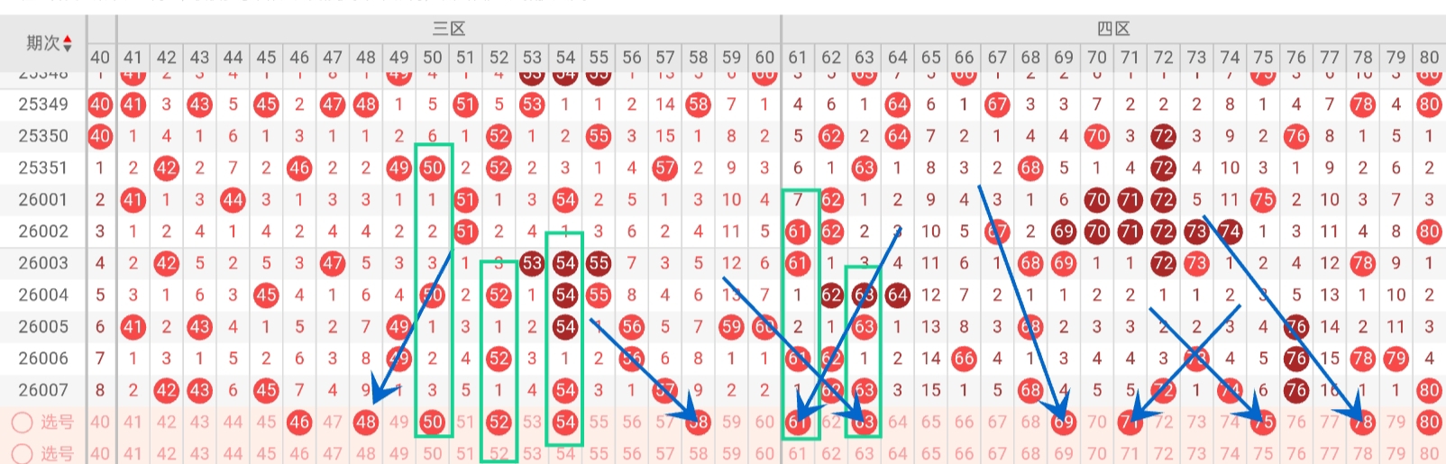 四区间上期开出62-63-68-72-74-76-80,共7个号码,本期大家可以根据尾数、隔期码、以及边码走势情况,本期首先需看61相邻码、64会再出现;上期62-80区间开出密集号,本期65出号机会比较大,本期四区有连续号64-65预测会出,上期龙头62,凤尾80,本期预测龙头61、凤尾78,本四区间建议大家关注号码64会出,再根据号码走势预防连续号64-65出现。综合分析筛选,本期四区推荐:61-63-69-71-75-78