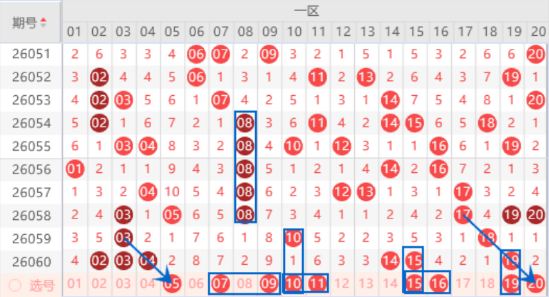 下图为01-20号数字区间走势分析图: