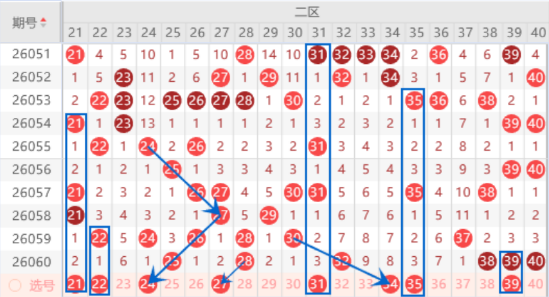 下图为21-40号数字区间走势分析图: