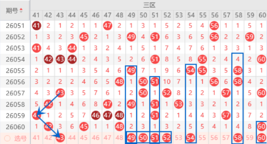 该区间的43号数字是属于V型号码,出号机会是有的,我们可以关注一下出号情况。本期的49 51号数字我们注意出一个号码的情况,本期的49号数字是属于空二对称号码,本期可以防守一下49 50号数字同出的情况,本期的51号数字是属于空一对称号码,本期可以防守一下51 52号数字同出的情况。本期的54 55号数字我们注意落下一个号码的情况,其中的54号数字可以重点关注一下出号情况。本期的58号数字是属于空四对称号码,本期可以防守一下出号情况。