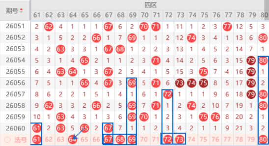 该区间上期开出了61 63 65 67号数字,本期我们注意一下出一个重号的情况,其中的61 67号数字可以重点关注一下,夹号我们关注一下64号数字的出号情况就行了。本期的68号数字是属于空七对称号码,出号机会是有的,我们防守防守一下68 69号数字同出的情况,毕竟69号数字是属于空一对称号码,是有机会出号的。本期的73号数字我们注意一下出号情况,属于三斜连号码,出号机会是有的,我们可以关注一下出号情况。
