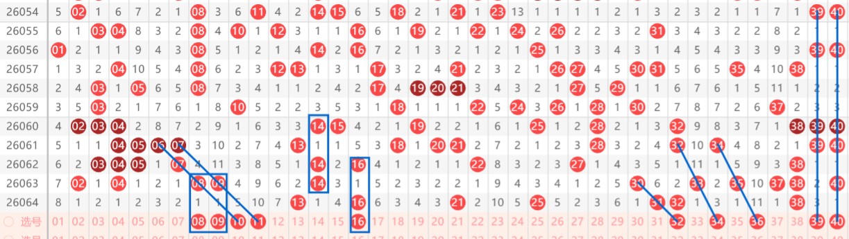 【第一区间1-40】上期开出7个号码。本期分析推荐:08-09-10-11-16-32-34-36-39-40十个号码。08-09对子遗漏一期出号形态,近期此形态较热;10-11等距斜连对子号码,在此号码段形成四连趋势;16其形态与14相同,注意防守;32-34-36偶数三连号码,在奇数三连间隔一期之后转换出号形态,32斜连,34-36间隔斜连;39横向大“V”形态号,与同路、遗漏一形态号码40组成对子在这个大盘中间出号趋势。区间推荐重点号码:一小区间08-09-11,二小区间39-40。