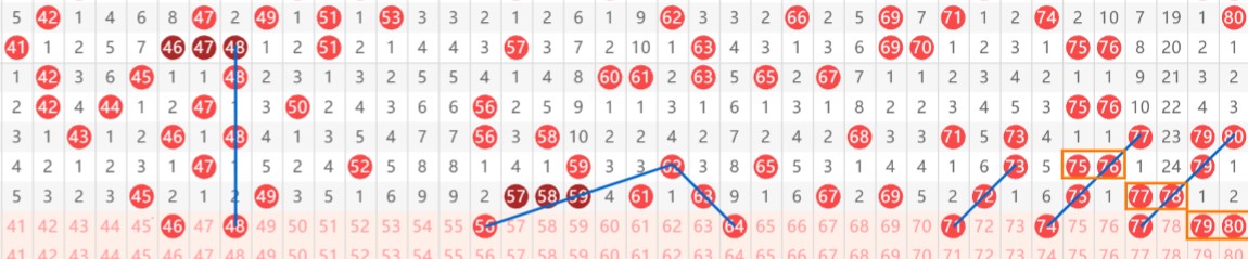 【第二区间41-80】:上期开出13个号码。本期推荐:46-48-56-71-74-77-79-80九个号码。46-48菱形边号,同时46等距、48为遗漏0-1-2形态,二者选一即可;56同路号码,与48同出和交替出号形态,作为防守;64斜连号码,考虑与74在区间同尾出号形态;71-74-77-79-80同路四连号码,各有走势,71三斜连,74-77四斜连,79-80等距斜连对子;注意把握近期7头逐渐走热,更关键的重点是,连续二期在7头开出同路完整形态号码,第三期开出就具备了充分的前置趋势。区间推荐重点号码:三小区间48-56,四小区间71-74-77-79-80。