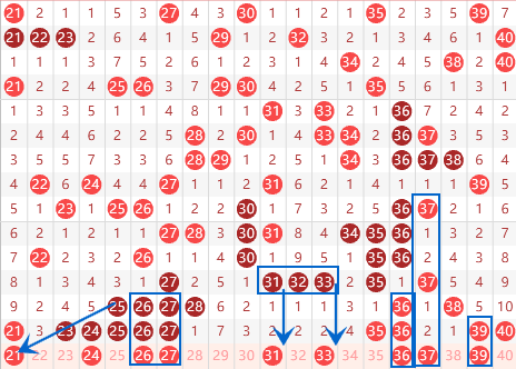 本期的21号数字我们要注意走重的情况,最好是做一下防守就可以了。我们重点关注一下23 24 25 26 27出重号的情况,其中的24 26 27出重的机会比较大,重点考虑一下24 26的出号情况。三连号31 32 33上期没能落号下来,本期我们要注意落下号码的情况。本期的36号数字我们也是要注意走三重的情况的,37号数字是属于空二对称,本期我们要注意36 37同出的情况。