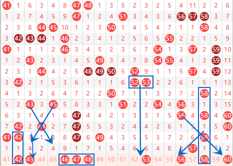该区间的42 43我们要注意一下出号情况,重点考虑一下43号数字的出号情况,属于中心对称回补号码,出号机会很大。本期的46 47 48我们要重点关注一下,这里出一个号码的情况很大,重点考虑47 48的出号情况。本期的连号52 53已经遗漏6期内有落号了,本期我们要注意落下一个号码的情况。本期的60号数字我们可以关注一下,它是属于冷号回补,也是三斜连号码,所以本期出号机会还是有的。