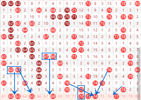本期的连号62 63我们要注意落号的情况,尤其是63号数字我们可以重点关注一下的。本期的67 68我们也是要注意落号的,从尾数走势来说67是三斜连,68是四斜连,都有出号的可能,所以本期我们要防守一下同出的可能。本期的70 74我们要注意出一个号码的可能,它们是属于交叉对称号码,这种类型的号码还是经常出的。本期的77号数字我们可以关注一下,它是属于遗漏8期的号码,本期应该也是会出一个的。