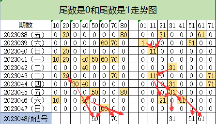 尾数0上期开出1个号码60,在同周期041期开出6个号码:10,20,40,50,60,70,