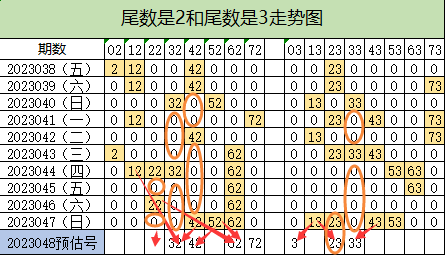 尾数3在上期开出4个号码:13,23,43,53,同周期开出3个号码:23,43,73,在040期号码13