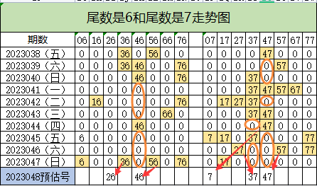 尾数6上期开出4个号码:06,36,56,76,同周期空期没有开出号码,在040期号码